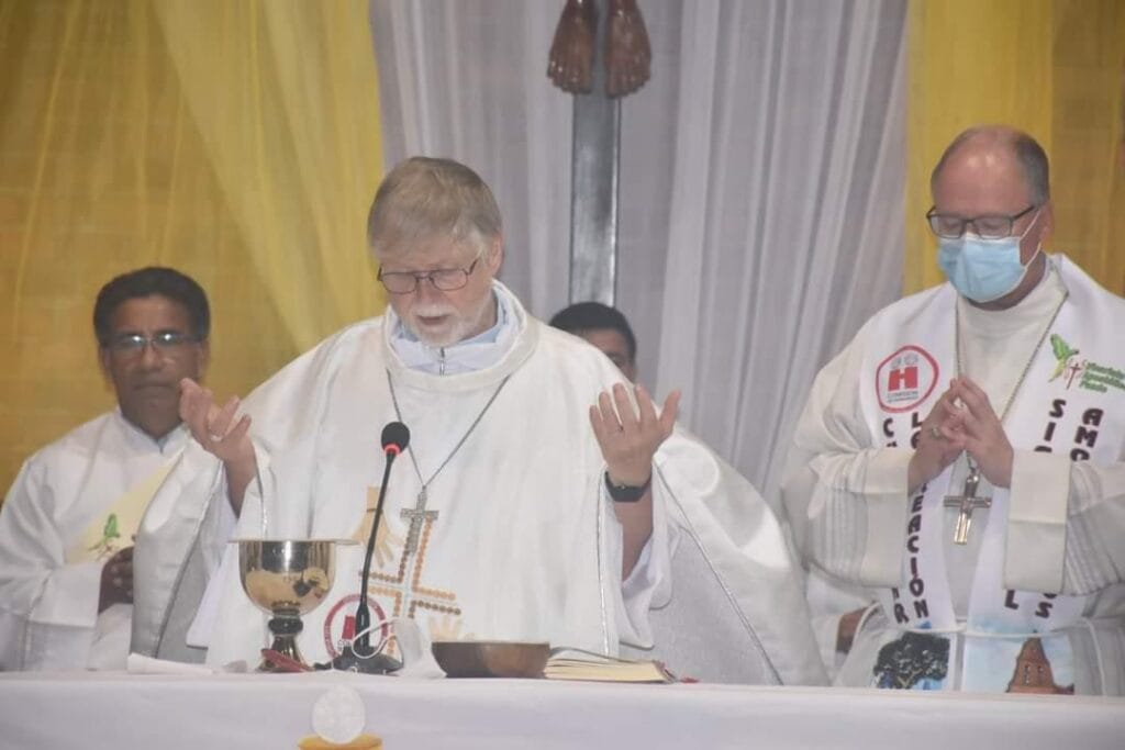 Prensa CEB 21.07.2022.- Mons. Eugenio Coter, Vicario Apostólico de Pando, la noche de ayer, dio la bienvenida, con la celebración de una eucaristía a la Comisión de la Hermandad de Tréveris (Alemania), encabezada por el Mons. Stephan Ackermann, Obispo de la Diócesis de Tréveris.