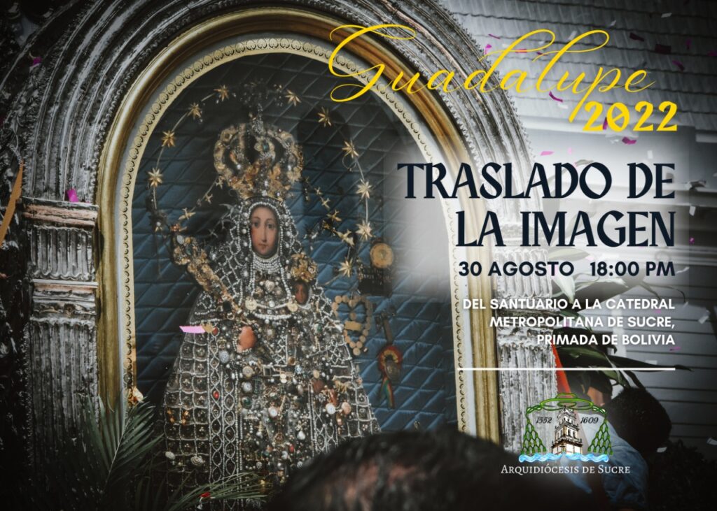 Iniciamos la novena el 30 de agosto con el traslado de la imagen desde su capilla a la Catedral Metropolitana de Sucre. Acompaña a nuestra madre la Virgen María en la advocación de Guadalupe con el Santo Rosario, novena y confesiones a hrs. 18:30, la eucaristía hrs. 19:00 y las tradicionales coplas a partir de las 20:00 pm.