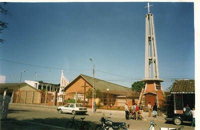 Foto: el templo Parroquial de Nuestra Señora de las Mercedes con su torre construida a fines de los años 30, destruida por una tormenta electrica a principios de los años 1960.