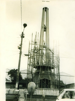 Foto: A mediados de los años 50, los padres Maryknoll dieron inicio a la construccion del templo parroquial concluyendose a principios de 1961; en esta foto se puede apreciar este proceso de construccion y la torre al fondo frente a la plaza en el area del atrio del templo parroquial.