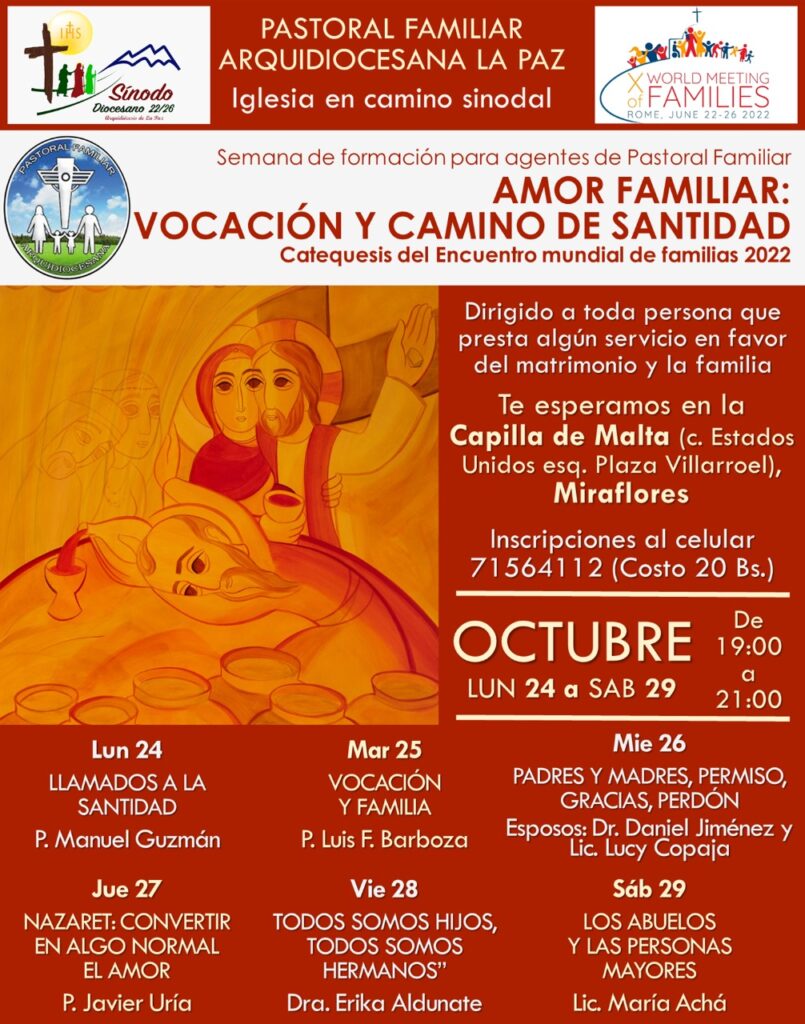 Prensa CEB 11.10.2022.- La Pastoral Familiar Arquidiocesana de La Paz invita a participar en la semana de formación para agentes de pastoral familiar con el tema ‘Amor familiar: vocación y camino de santidad’, que se realizará en la capilla de Malta, La Paz, y también de manera virtual, entre el 24 y 29 de octubre, de 19:00 a 21:00.