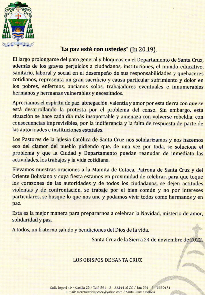 Prensa CEB 24.11.2022.- Mediante un comunicado, los Pastores de la Iglesia Católica de Santa Cruz, se solidarizan y hacen eco del clamor del pueblo, pidiendo que, de una vez por todas, se solucione el problema y que la Ciudad y Departamento puedan reanudar de inmediato las actividades, los trabajos y la vida cotidiana.