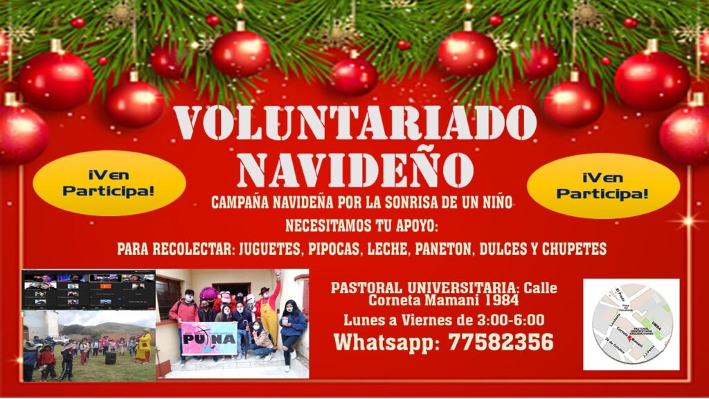 Prensa CEB 08.12.2022.- La Pastoral Universitaria en la Arquidiócesis de La Paz (PUNA), invita a todas las personas de buena voluntad a ser parte del voluntariado de Navidad, para la recolección de juguetes, golosinas y chocolate para compartir con los niños de las zonas rurales.