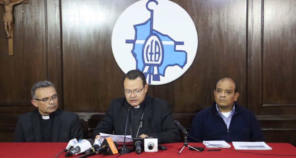 Mons. Fernando Bascopé, Obispo Auxiliar de la Diócesis de San Ignacio de Velasco y Obispo Presidente del Área de Educación de la CEB, Padre Diego Plá, secretario general adjunto CEB y Jorge Fernández, secretario ejecutivo del Área de Educación CEB, compartieron este mensaje con los medios de comunicación en la conferencia de prensa.