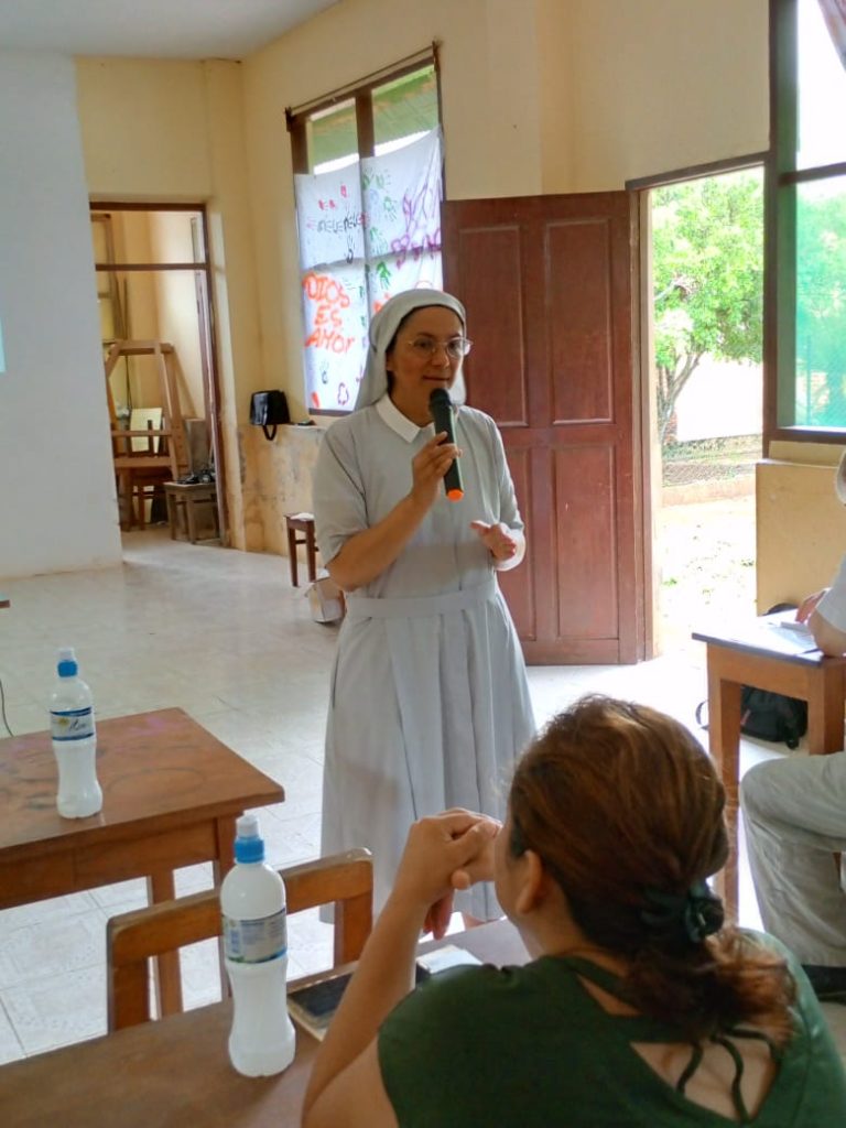 La doctora Erika Aldunate (representante elegida por el Santo Padre ante el Sínodo) y la Hna. María Eliana Flores (secretaria para la Pastoral de la Conferencia Episcopal Boliviana), hicieron eco del desarrollo del Sínodo en su etapa preparatoria, socializaron el desarrollo de las mesas de trabajo en Roma, pero también los desafíos que la asamblea sinodal ha demandado visibilizar y trabajar para hacer realidad una Iglesia donde todos formemos parte activa.