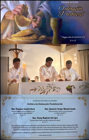 Prensa CEB 18.03.2025 La Diócesis de El Alto, en la Solemnidad de San José esposo de la Virgen María, está de fiesta, porque tres Diáconos: Francisco Condori Clares, Giancarlo Enrique Mamani Candia y Danny Manfredo Soto Lara recibirán el Sacramento del Orden Sacerdotal de manos del Obispo de El Alto-Mons. Giovani Arana, en la Catedral Virgen de la Candelaria a las 16:00 horas, el 19 de marzo 2025, en el marco del Jubileo de Esperanza convocado por el Papa Francisco.