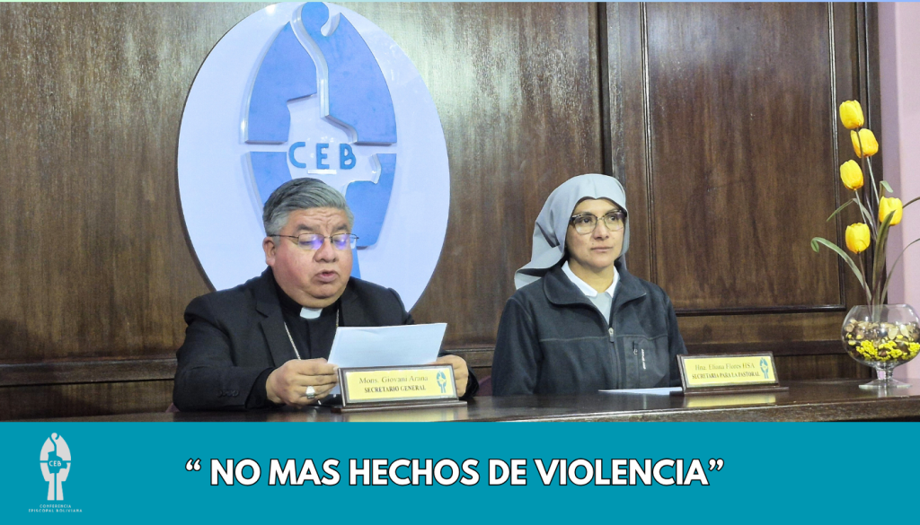 El Comunicado CEB: “No más hechos de violencia”, fue leído por el Secretario General CEB-Mons. Giovani Arana, Obispo de la Diócesis de El Alto, acompañó la secretaria para la pastoral Hna. Eliana Flores Solar, HSA.