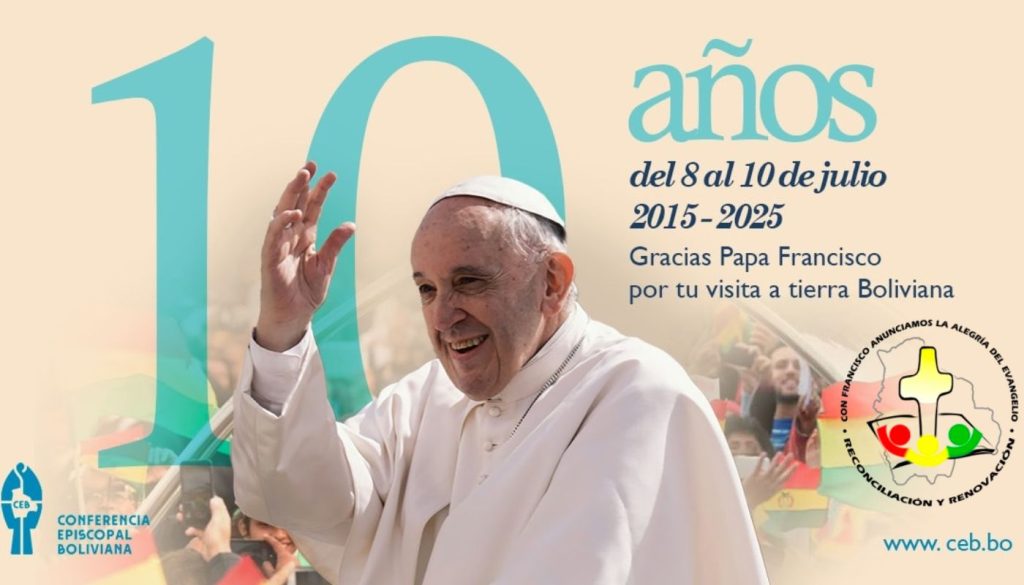 Prensa 08.07.2025 La histórica visita de Papa Francisco a tierra boliviana se realizó del 8 al 10 de julio del año 2015, este año la Iglesia boliviana recuerda 10 años de aquella bendecida visita a Latinoamerica a los paises de Ecuador, Bolivia y Paraguay.