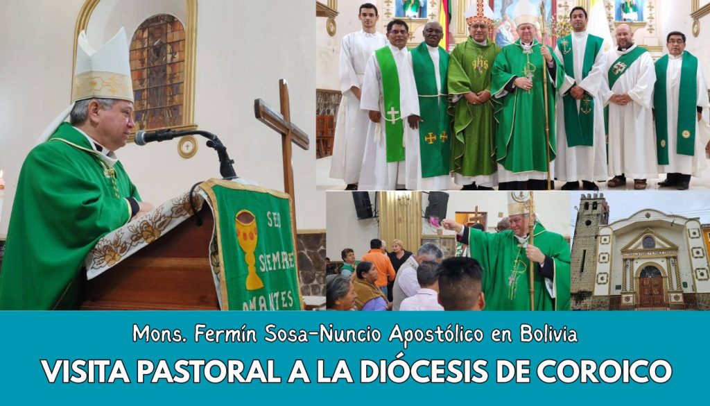 Prensa 28.07.2025 El Nuncio Apostólico en Bolivia, Mons. Fermín Sosa realizó la Visita Pastoral la Diócesis de Coroico, presidió la Eucaristía Dominical de este domingo 27 de julio, en la Catedral San Pedro y San Pablo de Coroico, concelebrada por Mons. Juan Carlos Huaygua y sacerdotes de la Diócesis, también el Secretario de la Nunciatura P. Ivan Martins. Los diferentes grupos de niños, jóvenes, laicos religiosas se dieron cita para participar de esta Eucaristía que cerró la visita pastoral del Nuncio que se realizó del 23 al 27 de julio del presente año.
