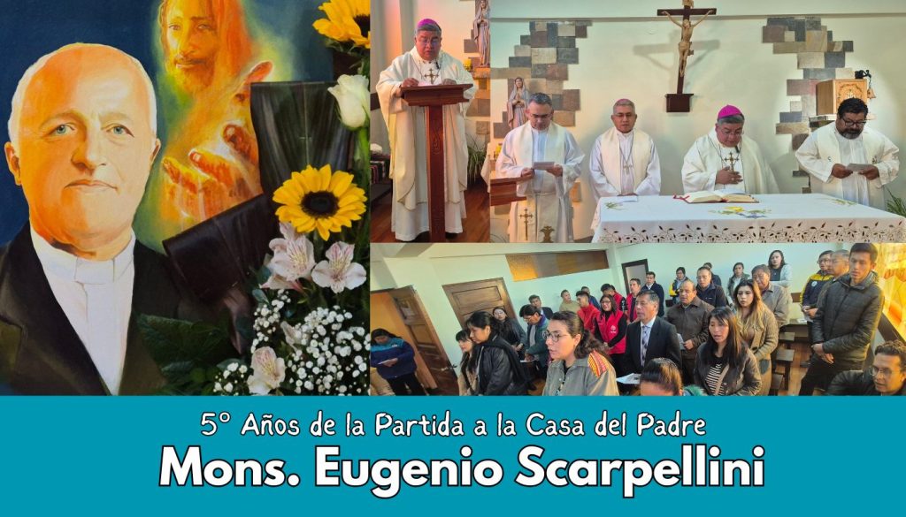 Prensa CEB 15.07.2025 Se recuerdan cinco años de la partida a la Casa del Padre de Mons. Eugenio Scarpellini, Obispo de El Alto, Director de las OMP-Bolivia, un gran misionero de nacimiento bergamasco pero de corazón boliviano, que partió en el año 2000. Con una Eucaristía en la Capilla de la Conferencia Episcopal Boliviana, Mons. Giovani Arana presidió la Eucaristía, concelebrada por Mons. Juan Carlos Huaygua, Padre Diego Plá, P. Giovani Mendoza y los Colaboradores de la CEB.