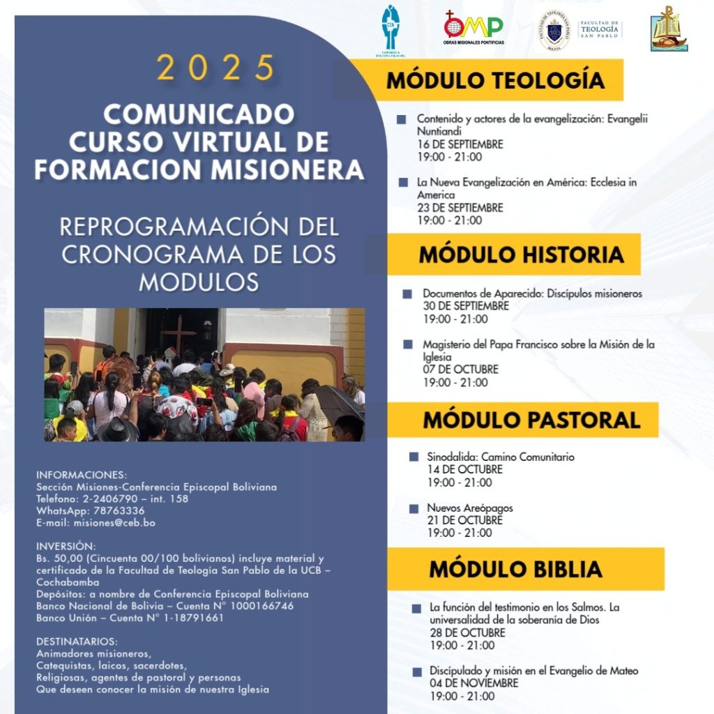Prensa CEB 20.08.2025. La Conferencia Episcopal Boliviana, desde el Área de Evangelización (Sección Misiones), las Obras Misionales Pontificias (OMP) y la Facultad de Teología «San Pablo» invitan a participar en el Curso de Formación Misionera de Tercer Nivel, diseñado para fortalecer y actualizar la acción misionera de todas las personas comprometidas con la pastoral de la Iglesia en Bolivia.