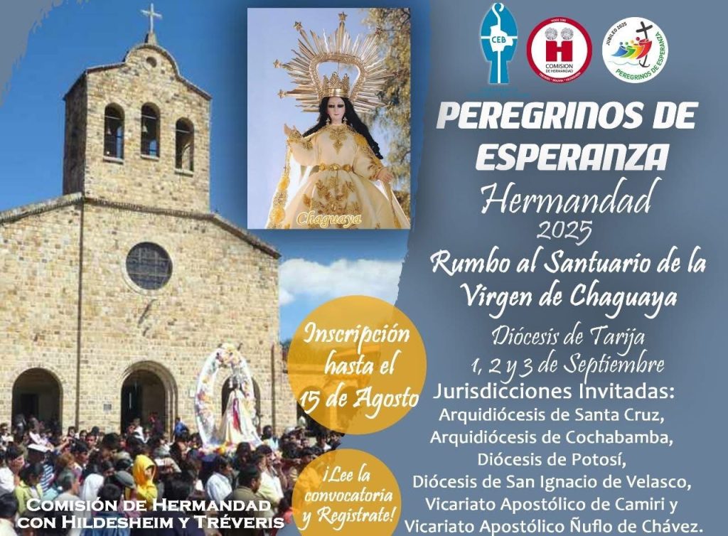 Prensa CEB 1.09.2025. La Diócesis de Tarija anunció oficialmente el inicio del encuentro «Peregrinos de Esperanza», un evento organizado por la Comisión de Hermandad de la Conferencia Episcopal Boliviana, el mismo tendrá lugar del 1 al 3 de septiembre de 2025, con una serie de actividades en torno a la celebración del Jubileo y la peregrinación al Santuario de la Virgen de Chaguaya. La conferencia de prensa estuvo encabezada por Monseñor Jorge Saldías, obispo de Tarija, Cecilia Dörfelt, secretaria ejecutiva de la Comisión de Hermandad, el Padre Ademar Gudiño, vicario pastoral, y Giovanna Valeriano, responsable de la Hermandad en Tarija.
