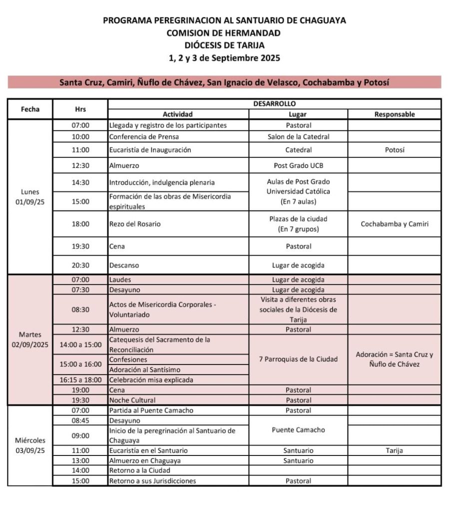 Entre las actividades previstas están la Eucaristía de inauguración en la catedral de Tarija, el rezo del Rosario, la catequesis, confesiones y una jornada especial de voluntariado donde los peregrinos visitarán 17 centros sociales, como hogares para personas mayores, comedores infantiles y otros servicios comunitarios para colaborar y compartir con sus beneficiarios. Esta experiencia busca enriquecer espiritualmente a los participantes y visibilizar el trabajo social de la Iglesia local.