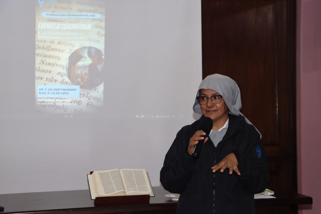 Prensa CEB 25.09.2025. La exposición sobre el «Evangelio cuadriforme y la confesión del centurión en Marcos», organizada por la Conferencia Episcopal Boliviana (CEB), inició hoy como parte de la formación permanente para colaboradores pastorales, en modalidad presencial, bajo la facilitación de la Hna. Eliana Flores HSA, actual Secretaria para la Pastoral de la CEB.