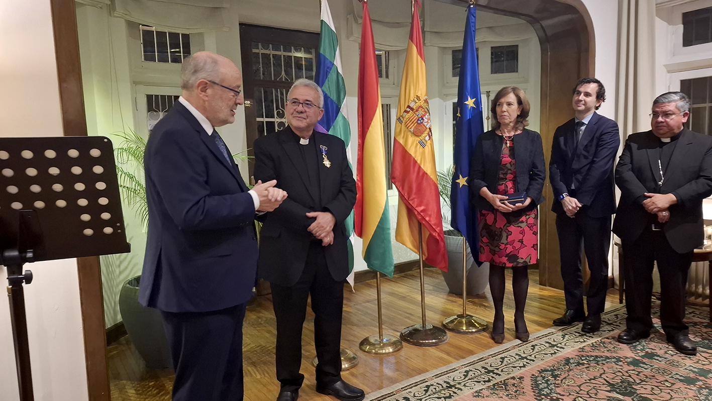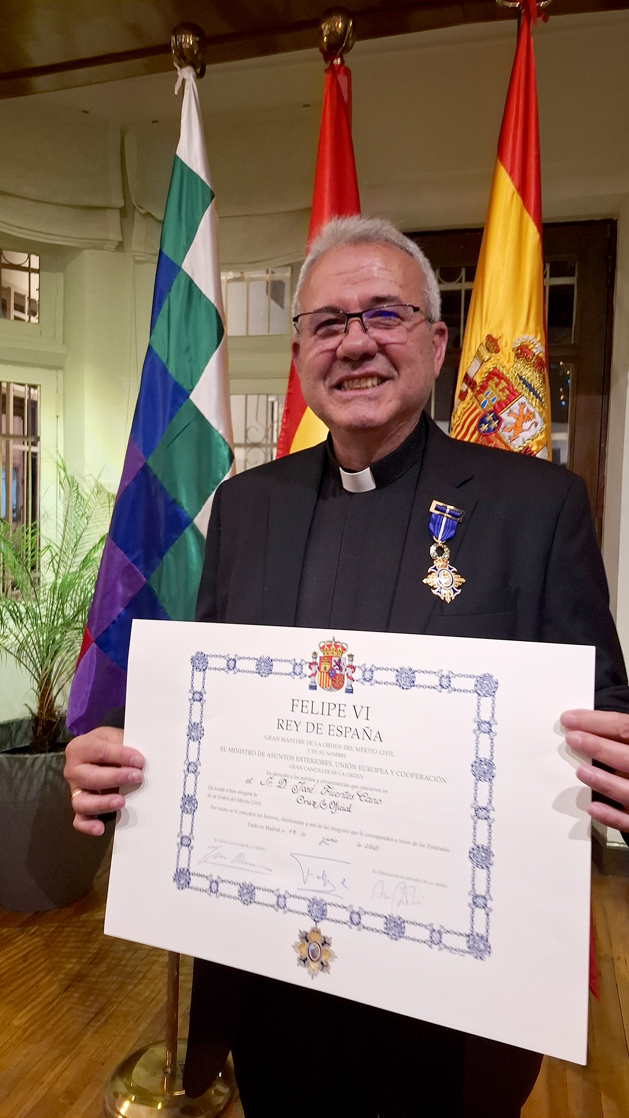 “Esta condecoración la agradezco a los que me la otorgan, pero realmente siento que es de todos ustedes y de algunos que no están hoy aquí. Va por ustedes y por ellos. Gracias por acompañar mi vida y por contribuir a que Bolivia y España sean más lo que tienen que ser: dos países hermanos”, finalizó el P. Fuentes Cano.