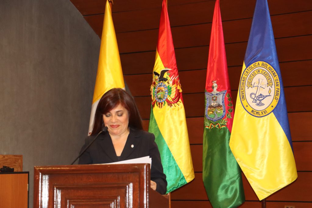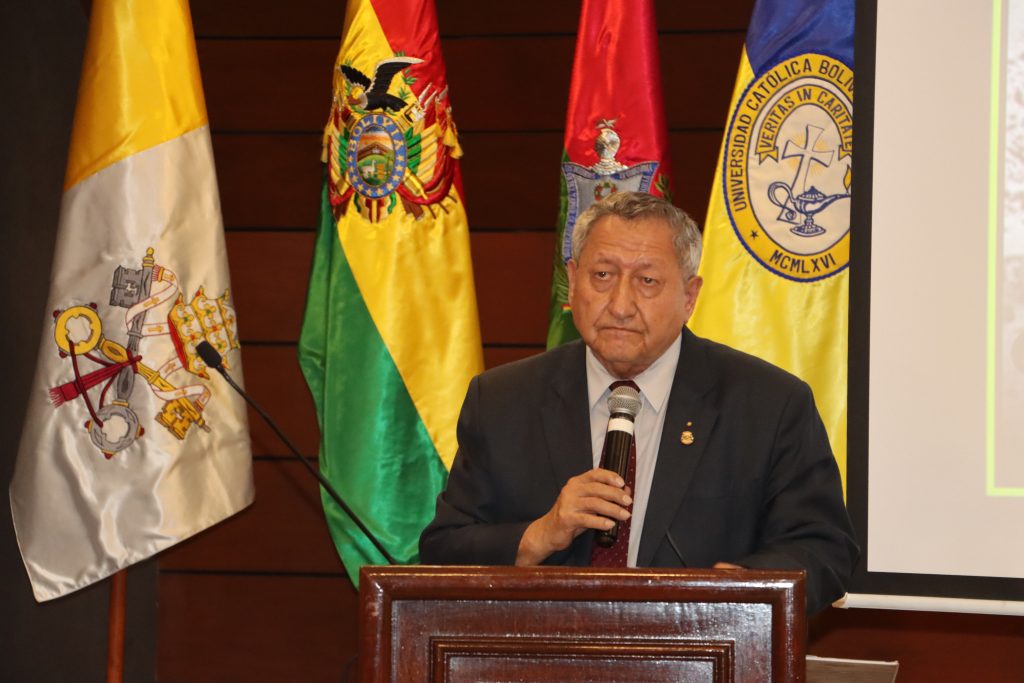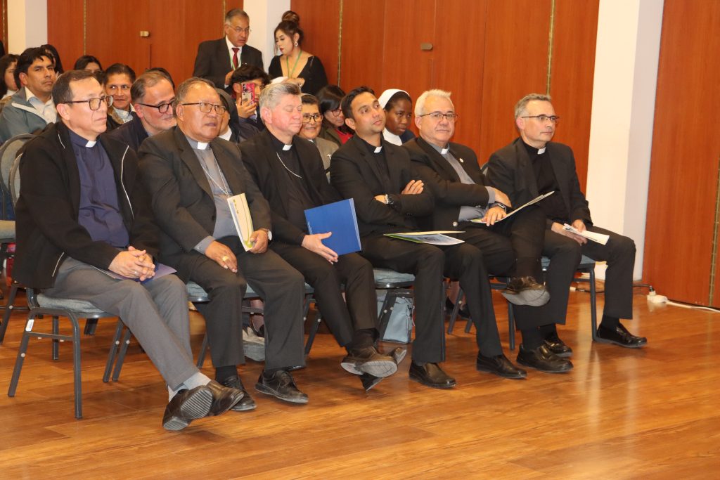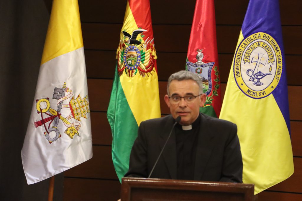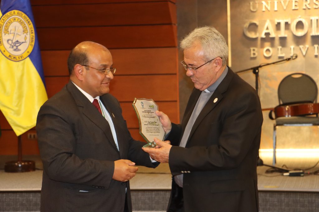 Las autoridaades que particparon: el Nuncio Apostólico Mons. Fermin Sosa, el Secretario de la Nunciatura P. Ivan Martis, el Rector de la UCB P. José Fuentes, tambié asistieron Mons. Pedro Fuentes, Mons. Pascual Limachi, el secretario general Adjunto CEB P. Diego Plá Aranda.
