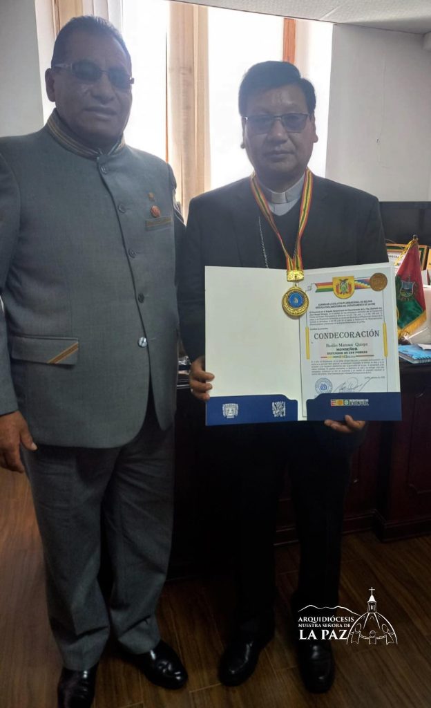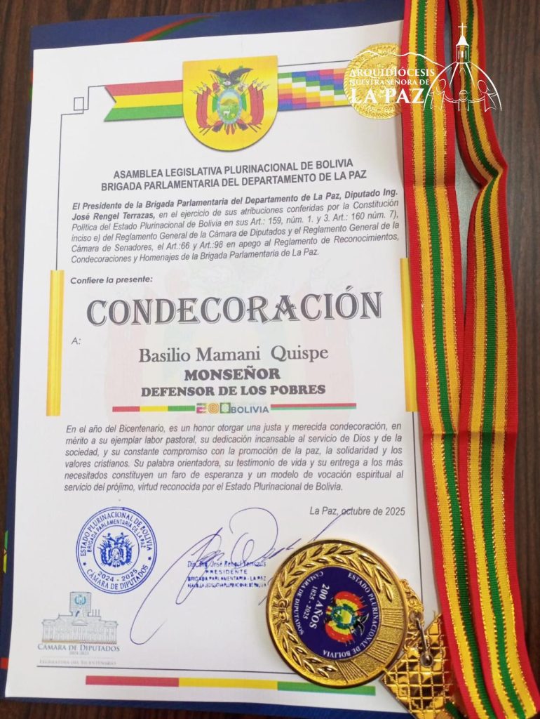 Así mismo, la Asamblea Legislativa Plurinacional de Bolivia, a través de la Brigada Parlamentaria del Departamento de La Paz, otorgó una condecoración de alto honor a Monseñor Basilio Mamani Quispe, obispo auxiliar de la Arquidiócesis Nuestra Señora de La Paz, reconocido como “Defensor de los Pobres”.