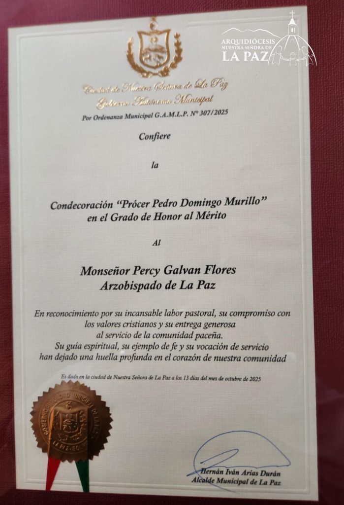 Monseñor Percy Galván Flores, arzobispo de La Paz, recibió en el Teatro Municipal Alberto Saavedra Pérez la Condecoración “Prócer Pedro Domingo Murillo” en el Grado de Honor al Mérito. Este reconocimiento, otorgado por el Gobierno Autónomo Municipal de La Paz, destaca su labor incansable, compromiso con los valores cristianos y su dedicación generosa a la comunidad paceña.