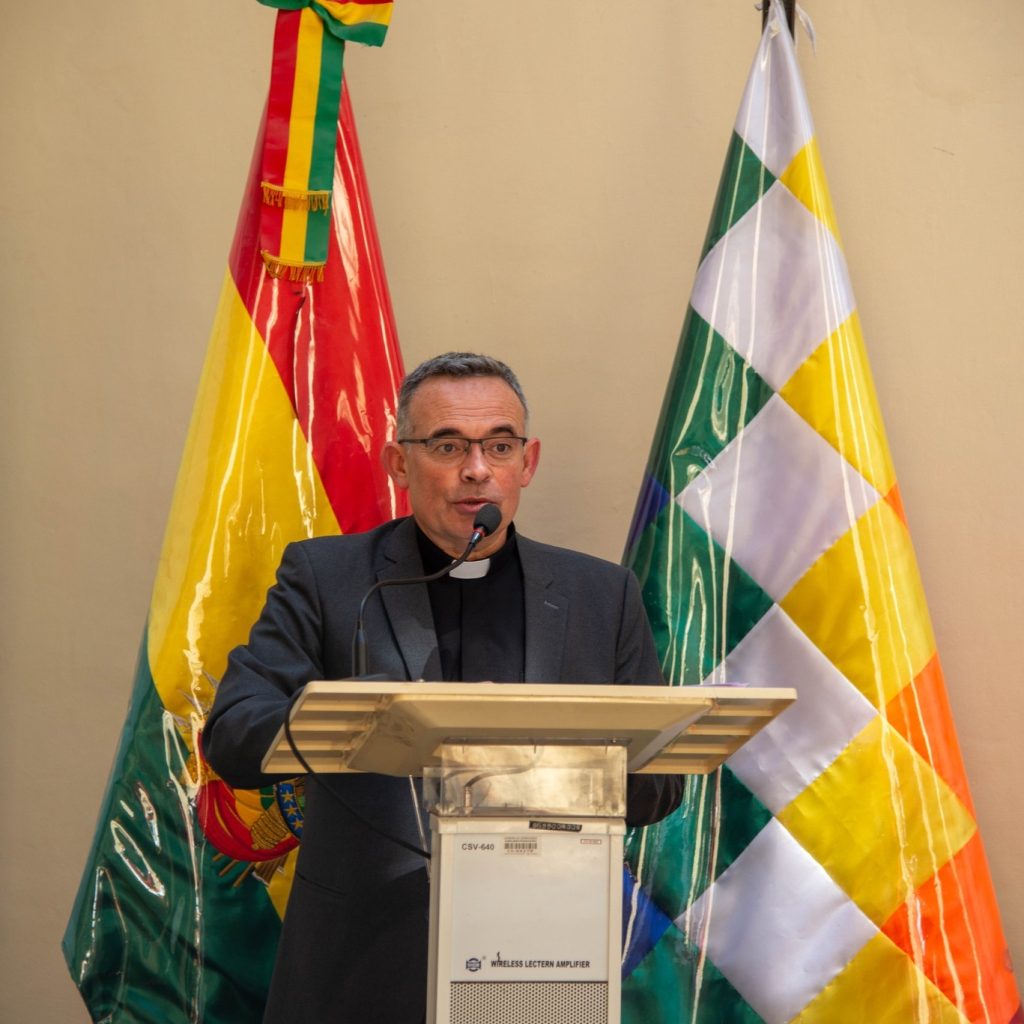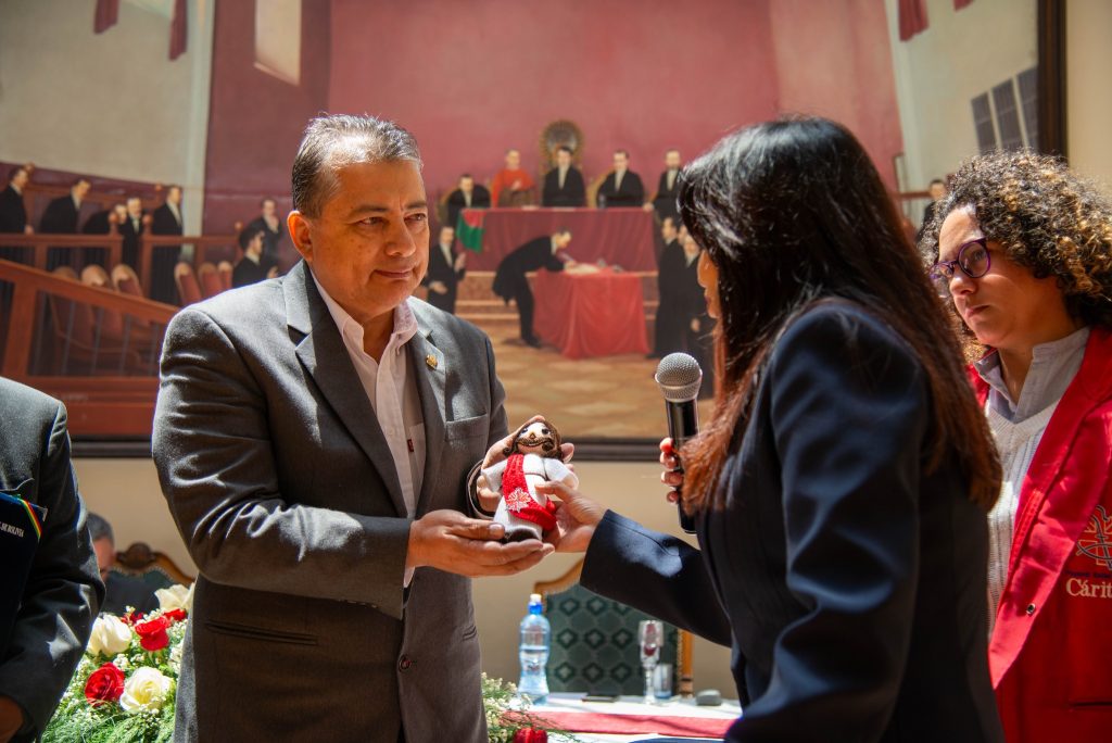 La distinción fue recibida por el Mons. Basilio Mamani, obispo Auxiliar de la Arquidiócesis de La Paz y parte de Pastoral Social Caritas Bolivia, junto a Padre Diego Plá Aranda, secretario general adjunto de la Conferencia Episcopal Boliviana y la Dra. Elizabeth Zabala, secretaria ejecutiva de Pastoral Social Caritas Bolivia.
