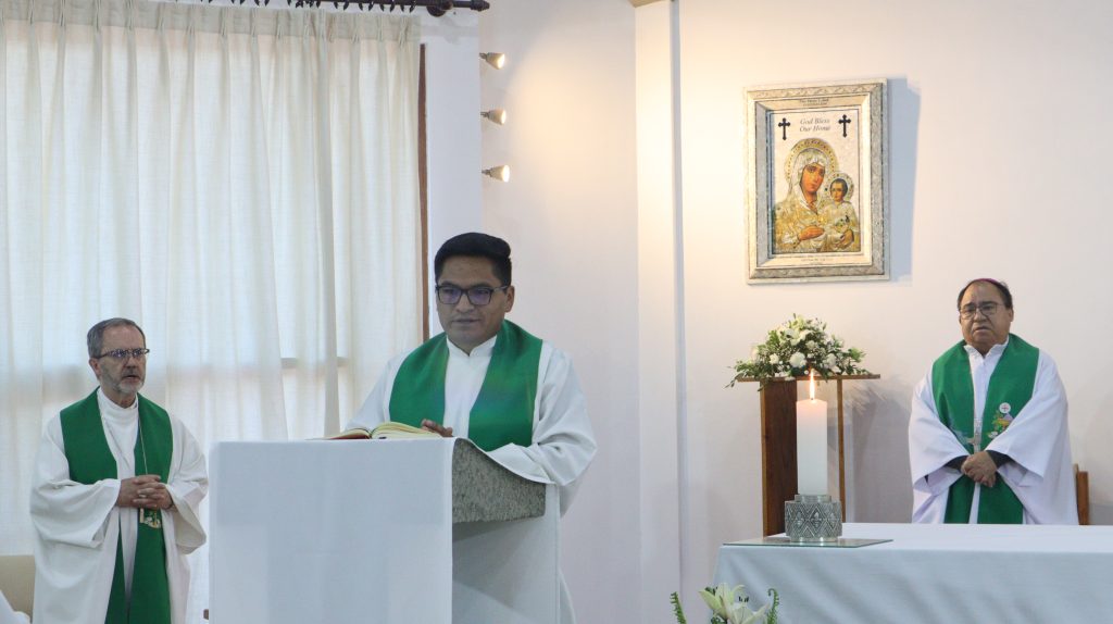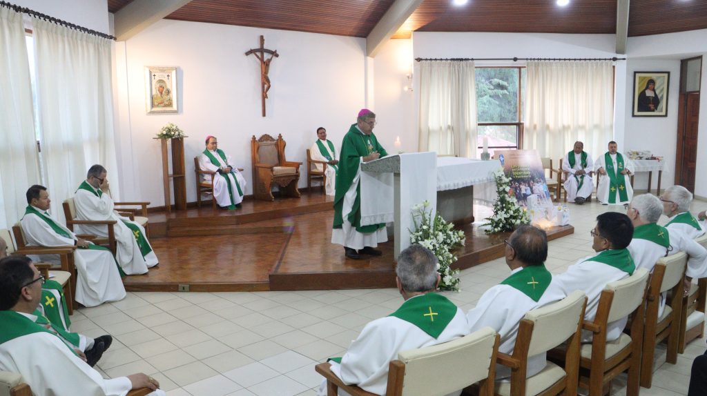 Prensa CEB 08.11.2025 La tercera jornada de la Asamblea de los Obispos inció con la Eucaristía presidida por el Mons. Jesús Galeote, Obispo del Vicariato Apostólico de Camiri y Obispo Presidente de Pastoral Social Cáritas Bolivia, donde participan los Obispos de Bolivia y algunos colaboradores de la Conferencia Episcopal Boliviana en la Capilla de la Casa Maurer donde se reúnen hasta el 11 de noviembre.
