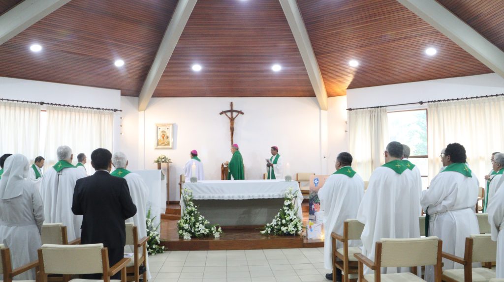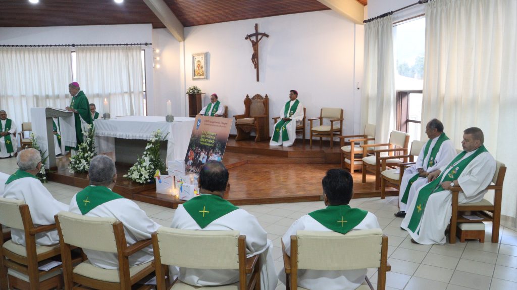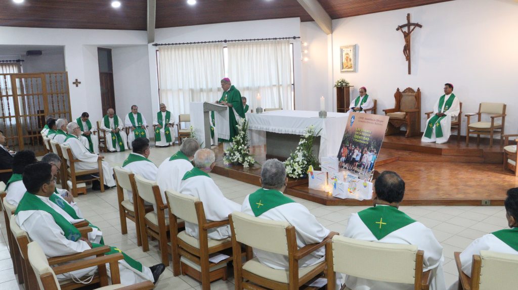Los Seminaristas del Seminario Mayor San José, animan las Eucaristías diarias durante la Asamblea de Obispos de Bolivia.
