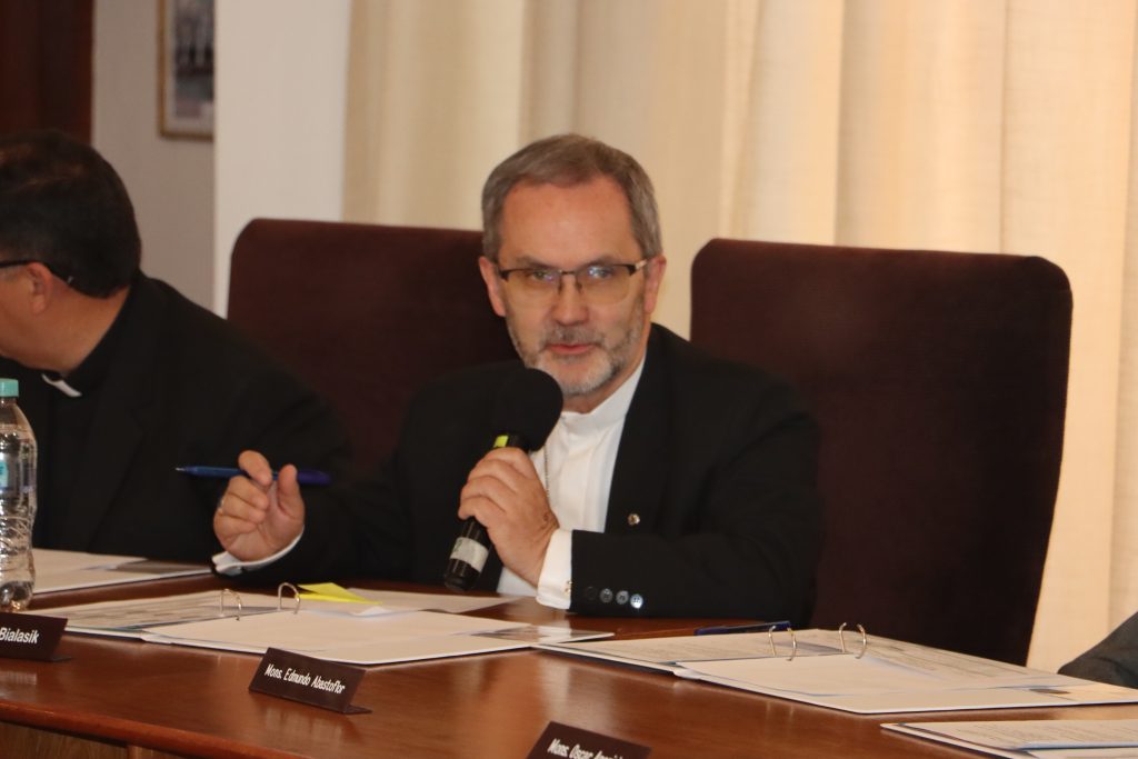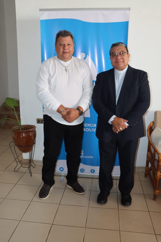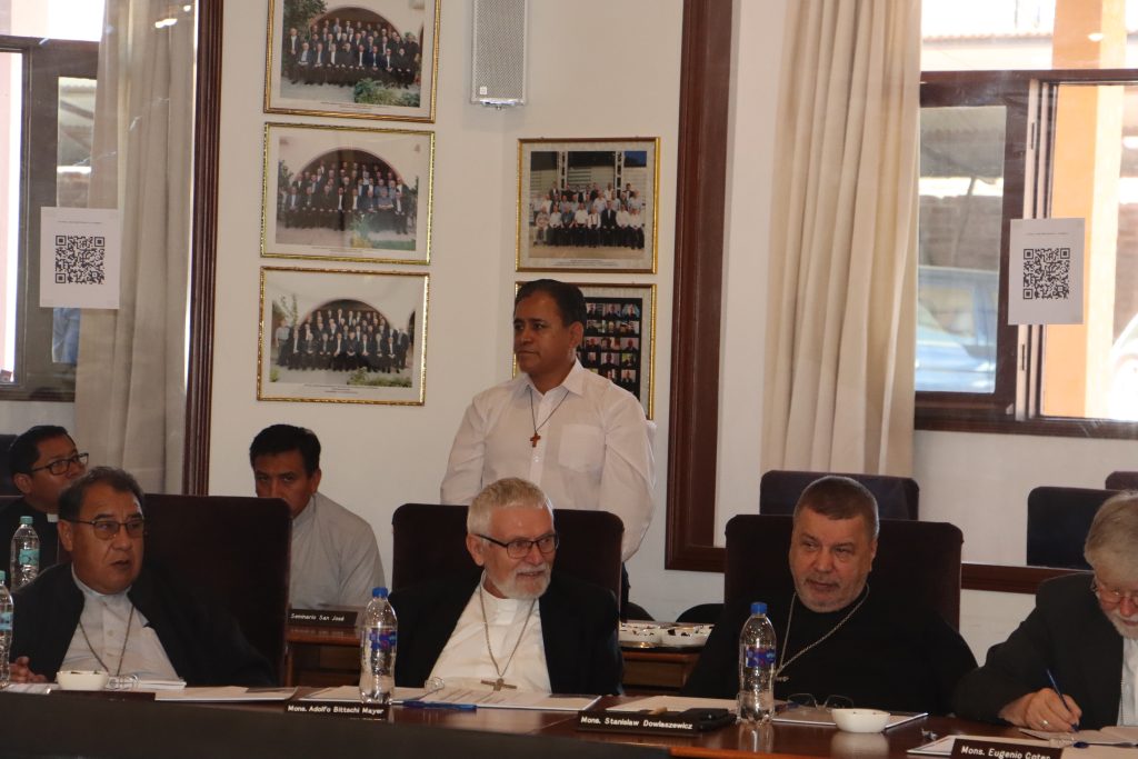 Prensa CEB 06.11.2025 En la plenaria de la Asamblea de Obispos el presidente del Área de Comunión Eclesial Mons. Cristóbal Bialasik presentó al nuevo presidente del Consejo Boliviano de Laicos Abdel Harib Guzmán López, que estuvo acompañado del Vocal CBL -Román Aizama.