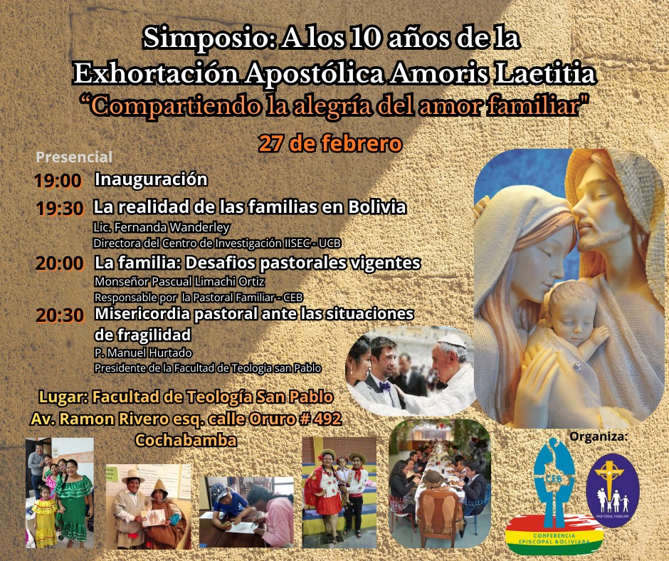 Prensa CEB 18.02.2026. La Pastoral Familiar del Área de Comunión Eclesial de la Conferencia Episcopal Boliviana convocan a un simposio por los 10 años de la Exhortación Apostólica “Amoris Laetitia”, con el propósito de reflexionar sobre los desafíos actuales de la familia y compartir la alegría del amor familiar en el contexto boliviano.