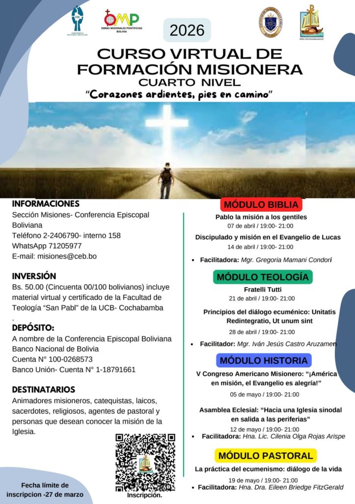 Prensa CEB 18.03.2027. La Sección Misiones de la Conferencia Episcopal Boliviana, en colaboración con las Obras Misionales Pontificias, invitan al Curso Virtual de Formación Misionera – Cuarto Nivel 2026. Bajo el lema “Corazones ardientes, pies en camino”, esta iniciativa académica y espiritual está dirigida a agentes de pastoral, catequistas, laicos, sacerdotes y religiosos de todo el país. El programa busca profundizar en la misión evangelizadora de la Iglesia a través de una modalidad completamente virtual con sesiones nocturnas, facilitando así la participación desde cualquier región de Bolivia.