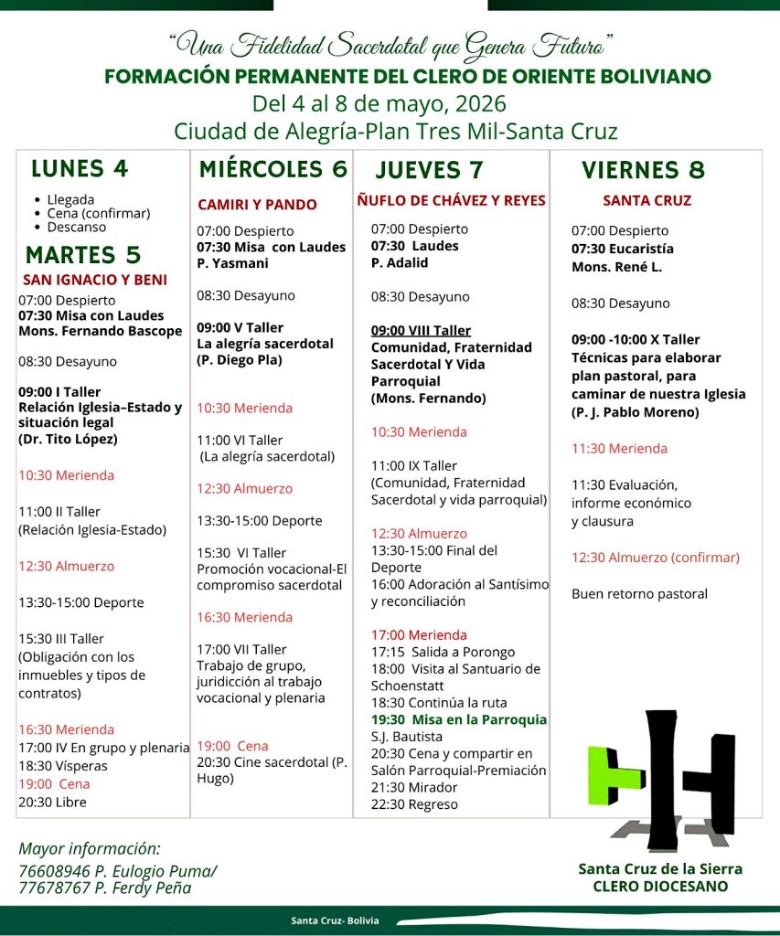 La Ciudad de la Alegría en el Plan 3.000, será sede del “Encuentro de Formación Permanente del Clero del Oriente Boliviano 2026” que reunirá a sacerdotes de distintas jurisdicciones del país en una semana dedicada a la formación, espiritualidad y fraternidad.